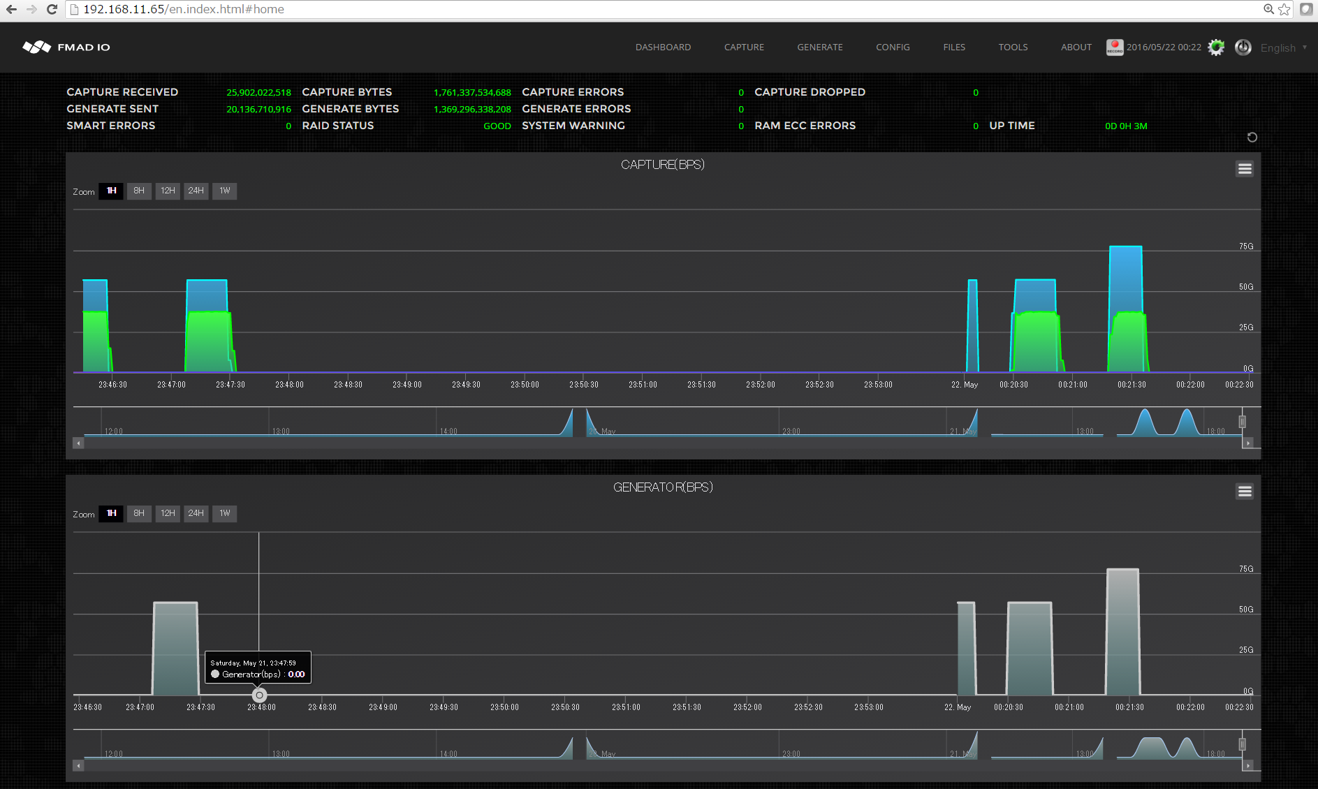 100GbEパケットキャプチャーが遂に実現しました! FMADIO100システムはスタイリッシュな2Uシャシーを採用し、前面にはホットスワップ可能な48基のSSD (7mm) を、背面にはホットスワップ可能な4基のOSドライブとホットスワップ可能な800Wデュアル電源を装備しています。1年365日、ノンストップでの運用に配慮した構成です。パケットキャプチャネットワークカードにはXilinxの最新式Virtex Ultrascale FPGAを採用し、デュアルソケットにIntelの2600v3CPUを装着したIntel製サーバー用マザーボードでこれを駆動します。
